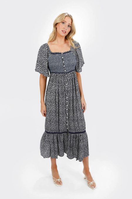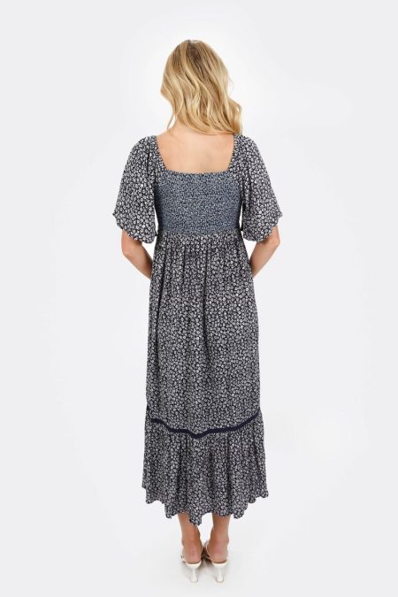 Maeve Smocked Buttoned Midi Dress – Midnight