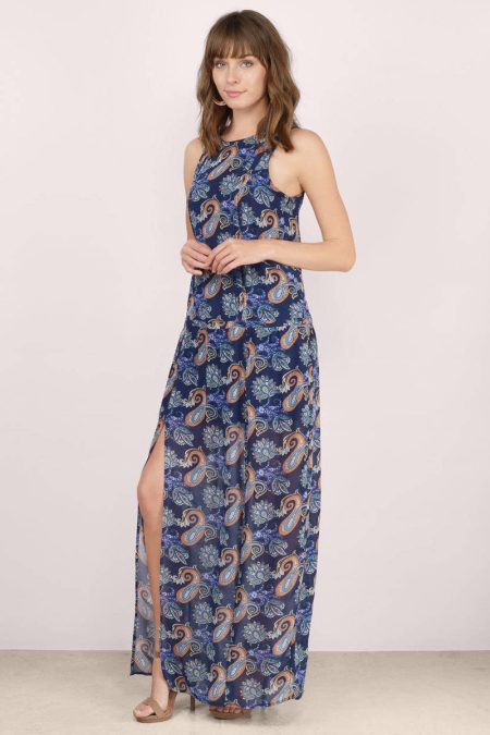 Abrianna Paisley Print Double Slit Maxi Dress – Navy Multi