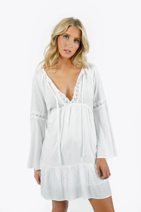 Description Slip into this charming lace-trimmed mini dress made from airy rayon fabric, the Carmilla Lace Bell Sleeve Mini Dress in White. Featuring soft bell sleeves, a babydoll cut, and flirty lace trim along the neckline and hem, this little white dress is sweet and sassy all at once. Pair…
