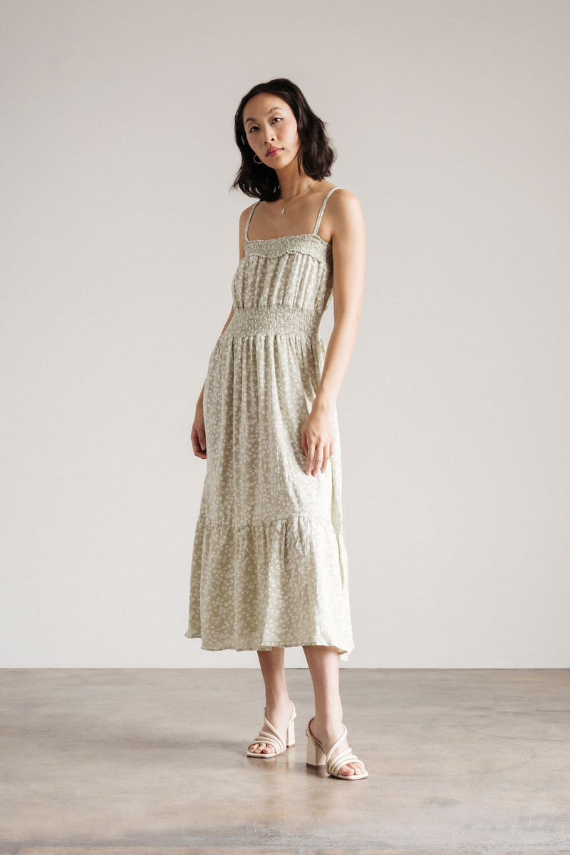 Take your style up a notch with the Hypnotize Me Floral Tiered Midi Dress in Green. With its captivating floral print and flowing silhouette, this floral smocked dress will have you looking like a bohemian goddess. The square neckline and cami straps are perfect for showing off your sun-kissed skin. The tiered skirt and shirred waistband give the dress beautiful movement, making it perfect for twirling on the dance floor all night long.